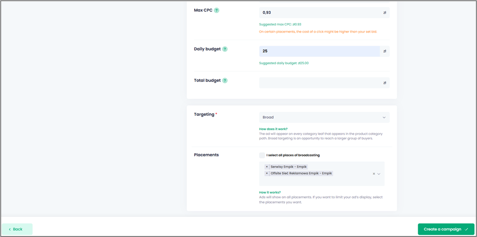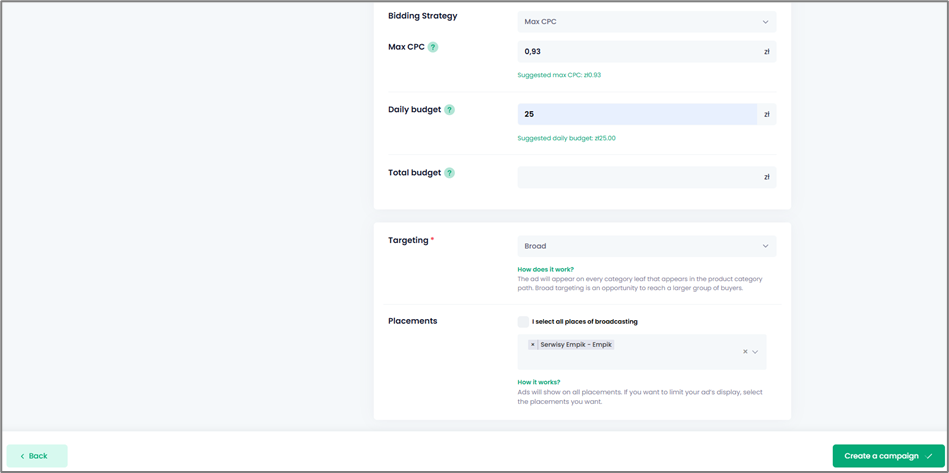 creating a new campaign in the Empik Ads panel. For active campaigns, this