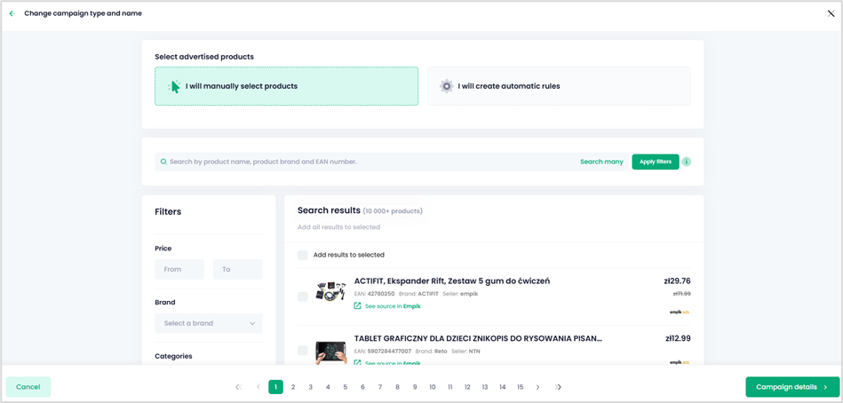 campaign using filters and the search tool. The product list remains fixed