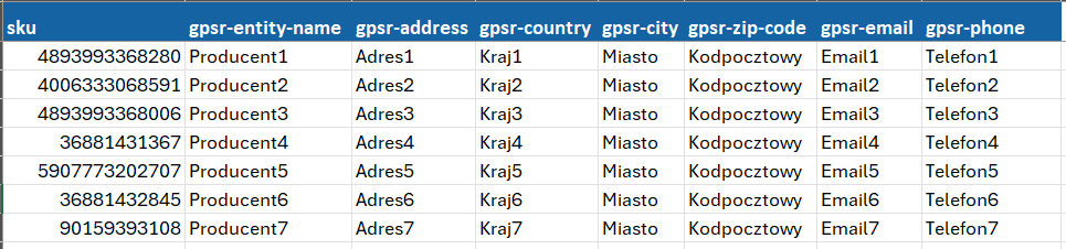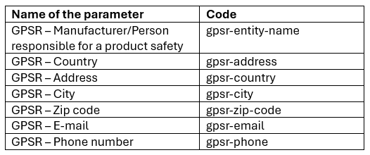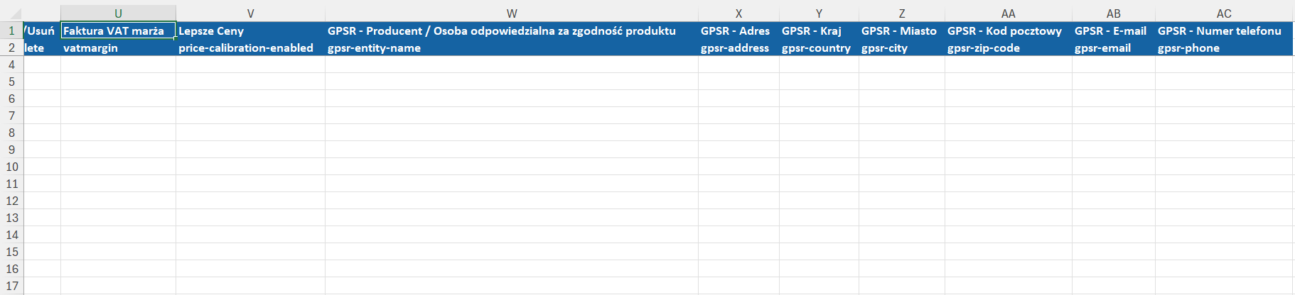 Adding GPSR parameters via the API (OF01) during creating an offer should include GPSR parameters with their codes (depending on the use of a CSV/XML/XLSX import file).