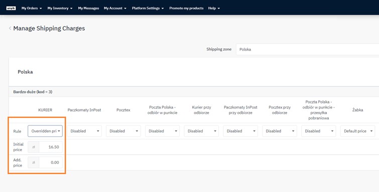 3. Select a logistic class to which you will assign your offer later. There are 3 fields to edit next to your preffered shipping methods.