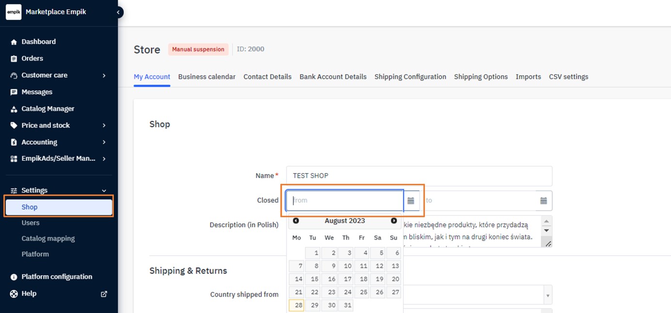 In the field ”Closed,” set the dates, when the shop is supposed to be closed and when it is supposed to be reopened.