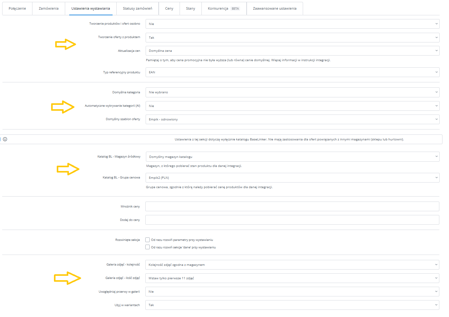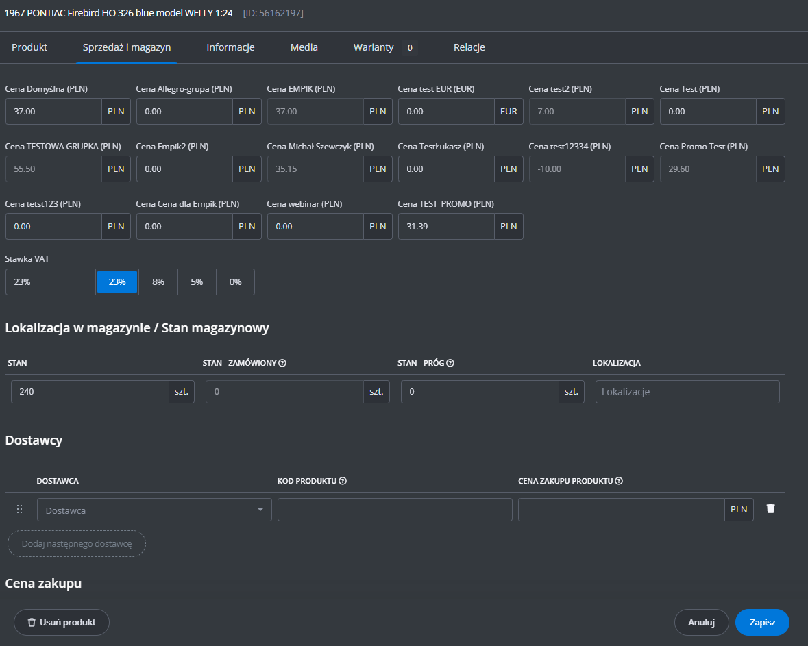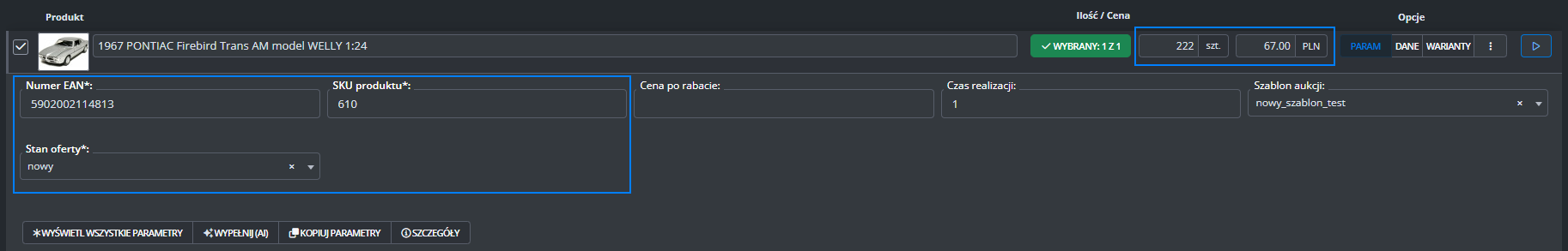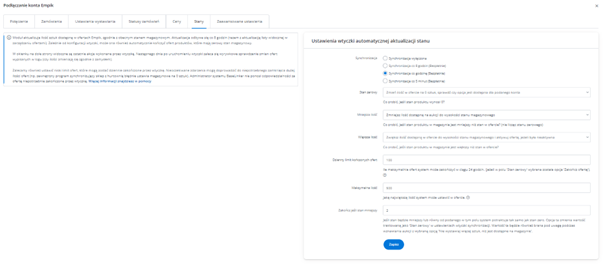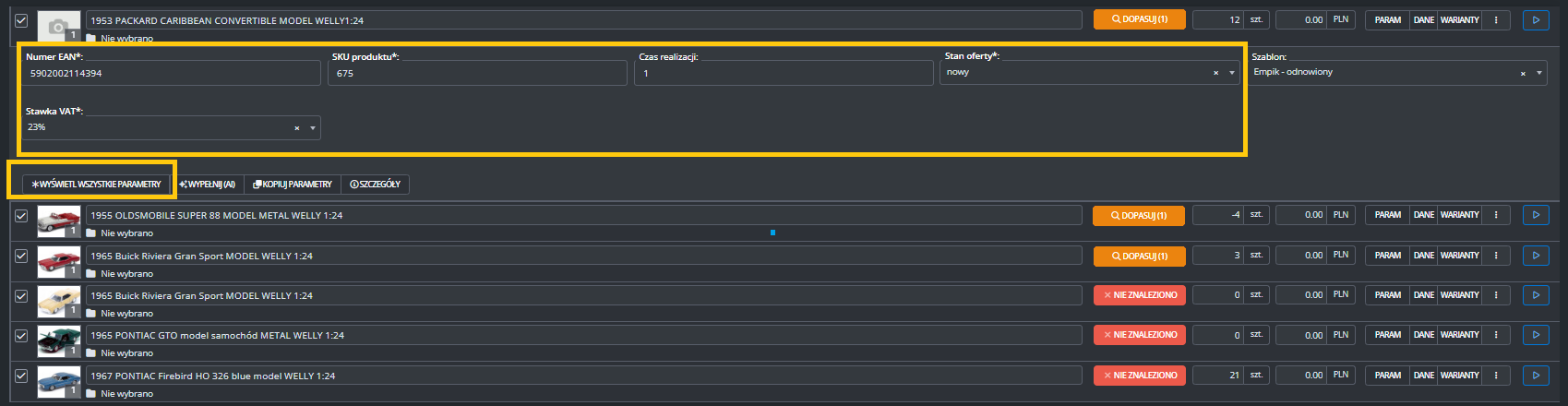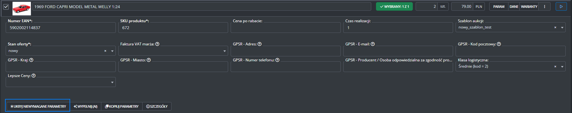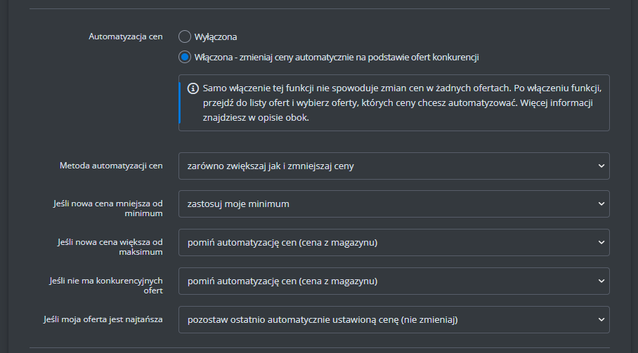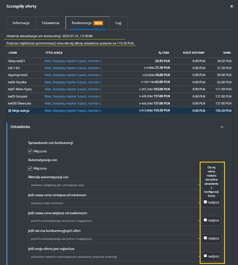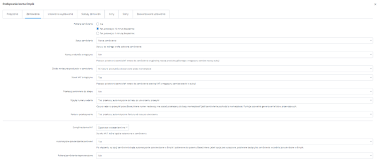 Dodatkowe ustawienia (ceny, czas wysyłki, stan, klasa logistyczna)