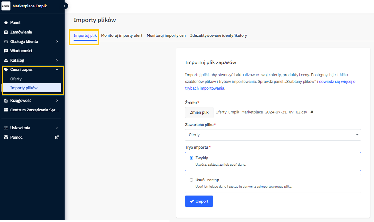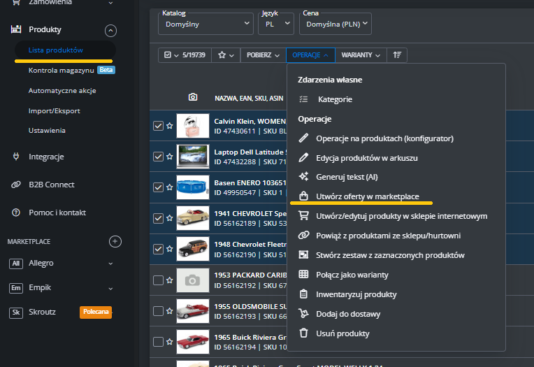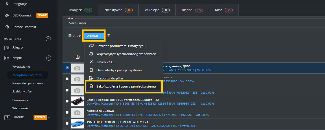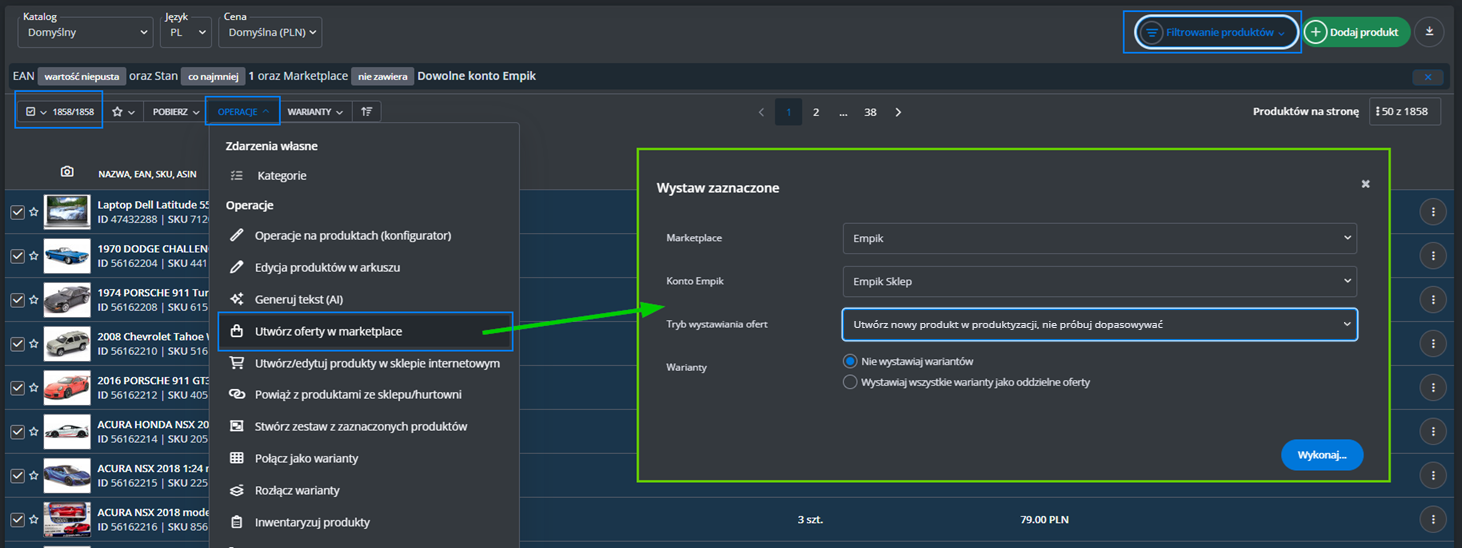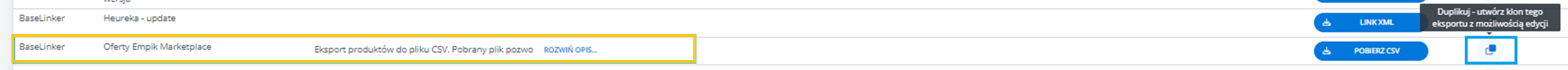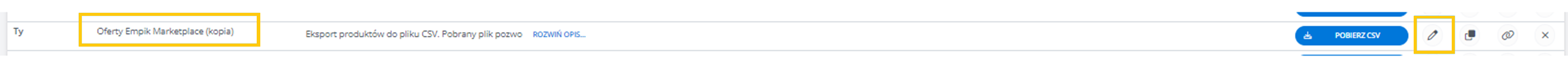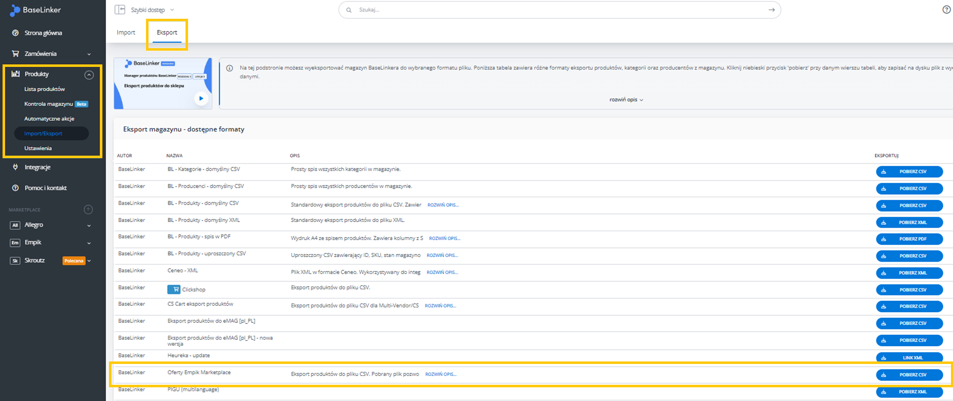 W menu przejdź do Produkty -> Import/Eksport -> Eksport i znajdź eksport "Oferty Empik Marketplace".