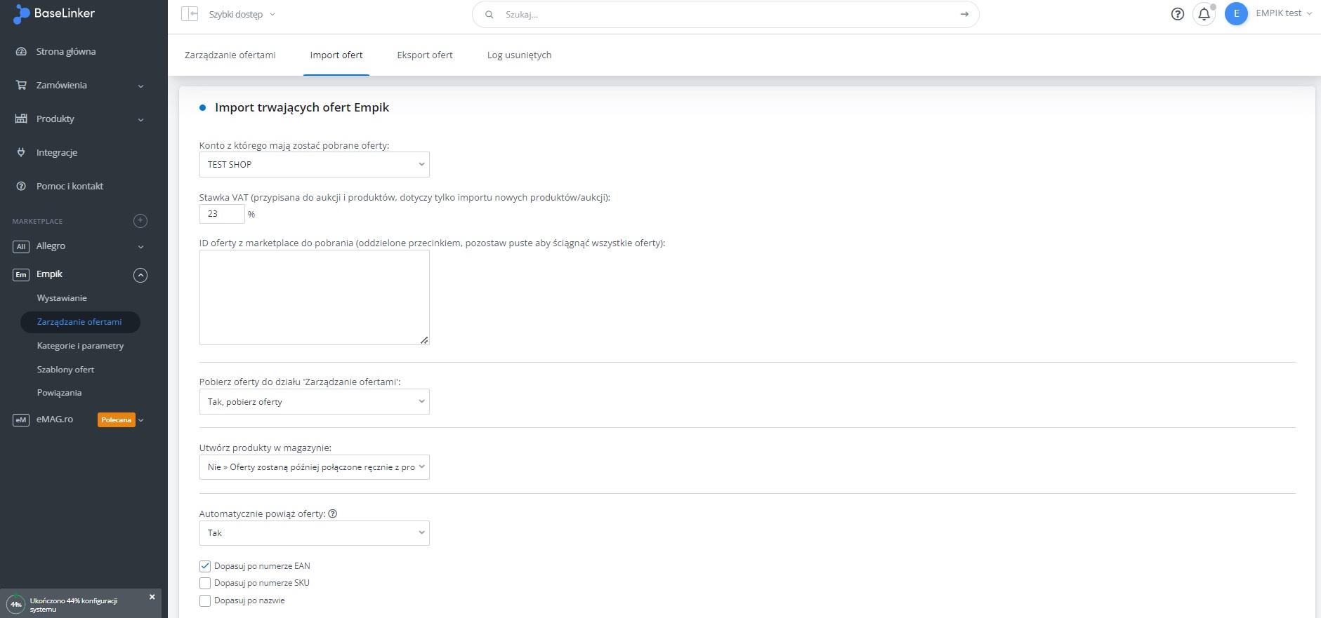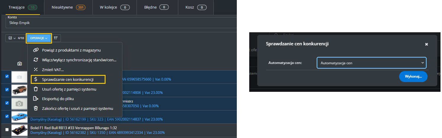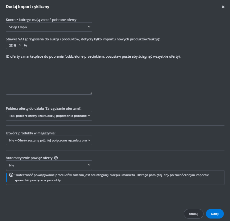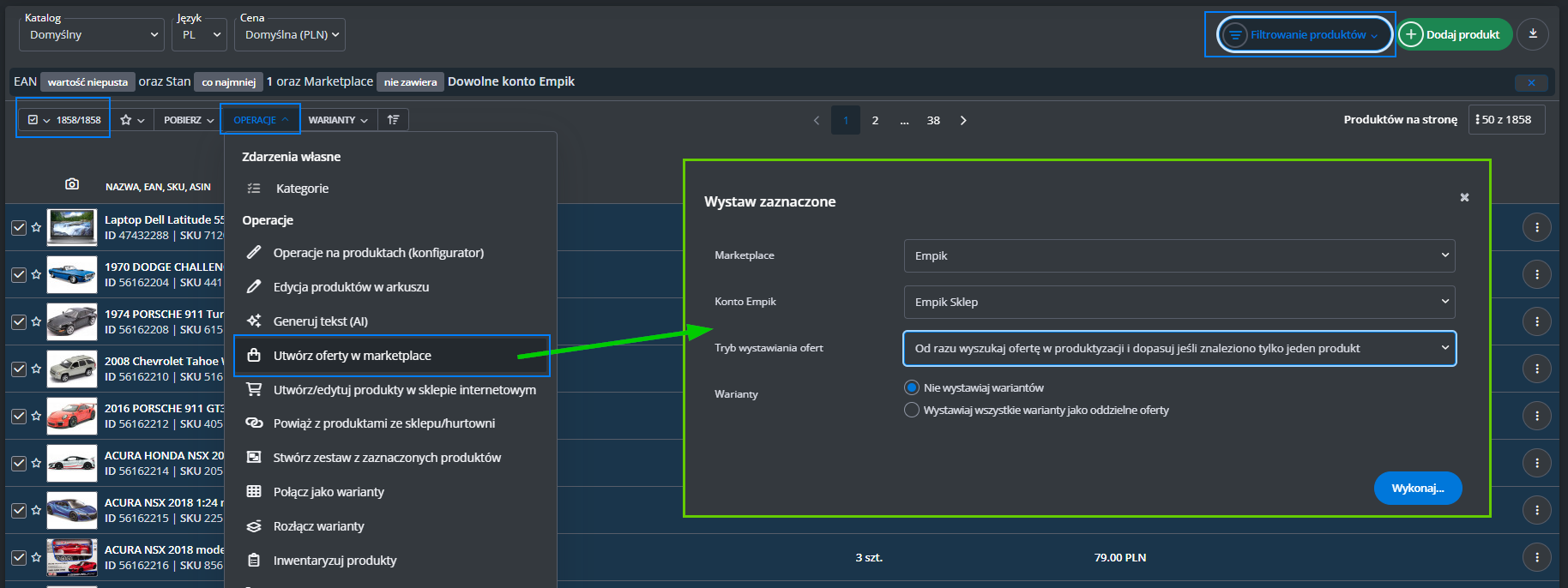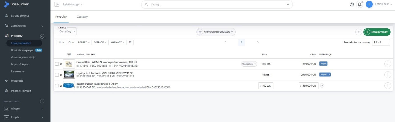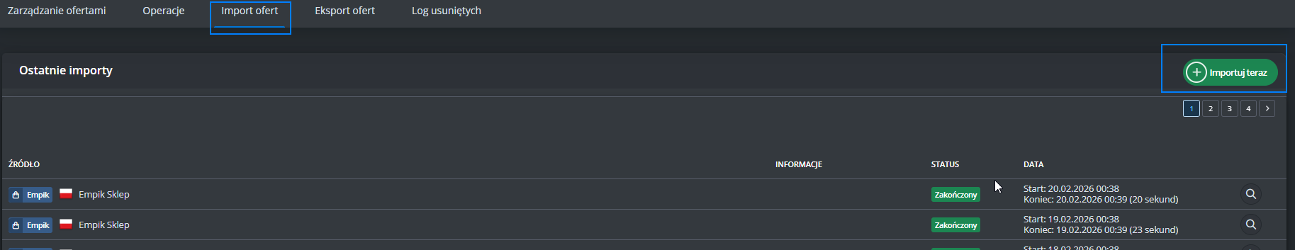 W menu przejdź do Produkty -> Import/Eksport -> Eksport i znajdź eksport "Oferty Empik Marketplace".
