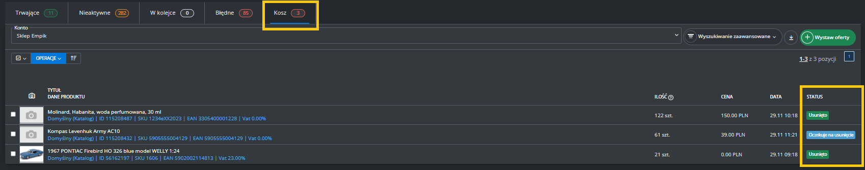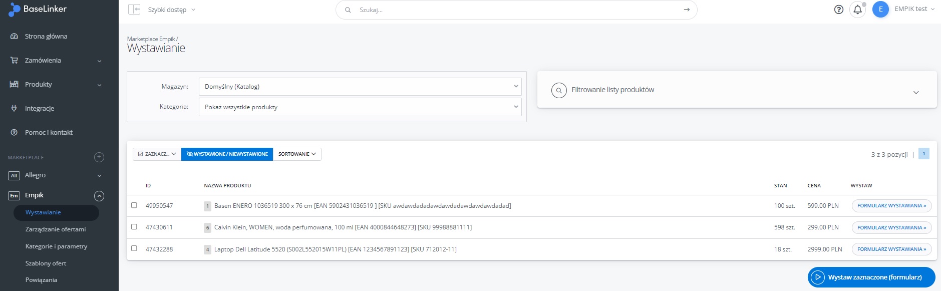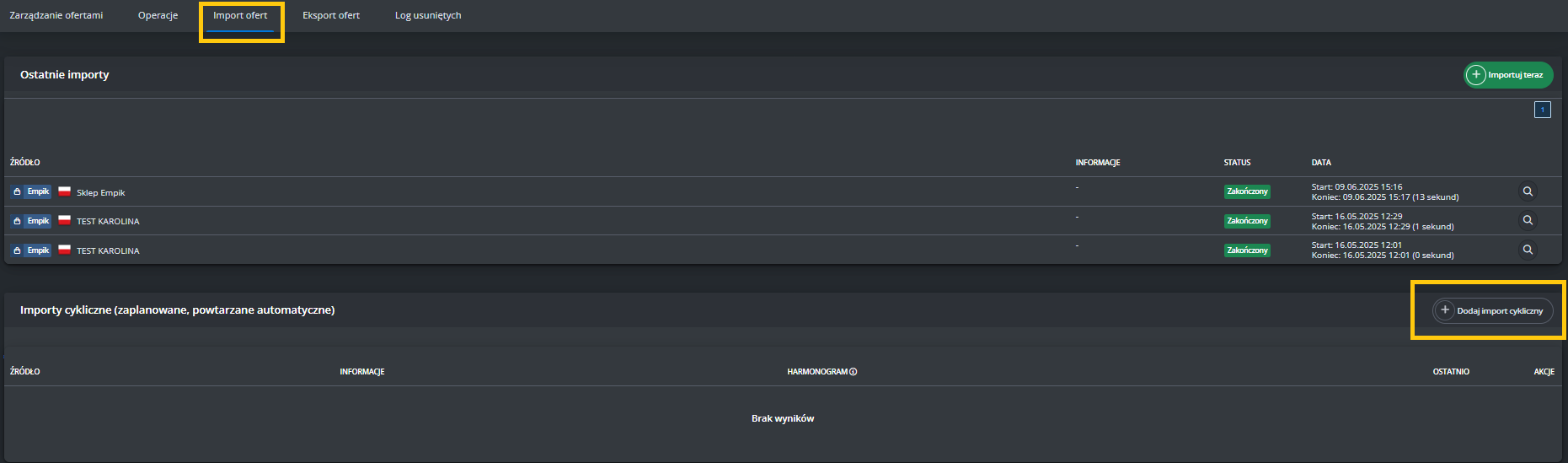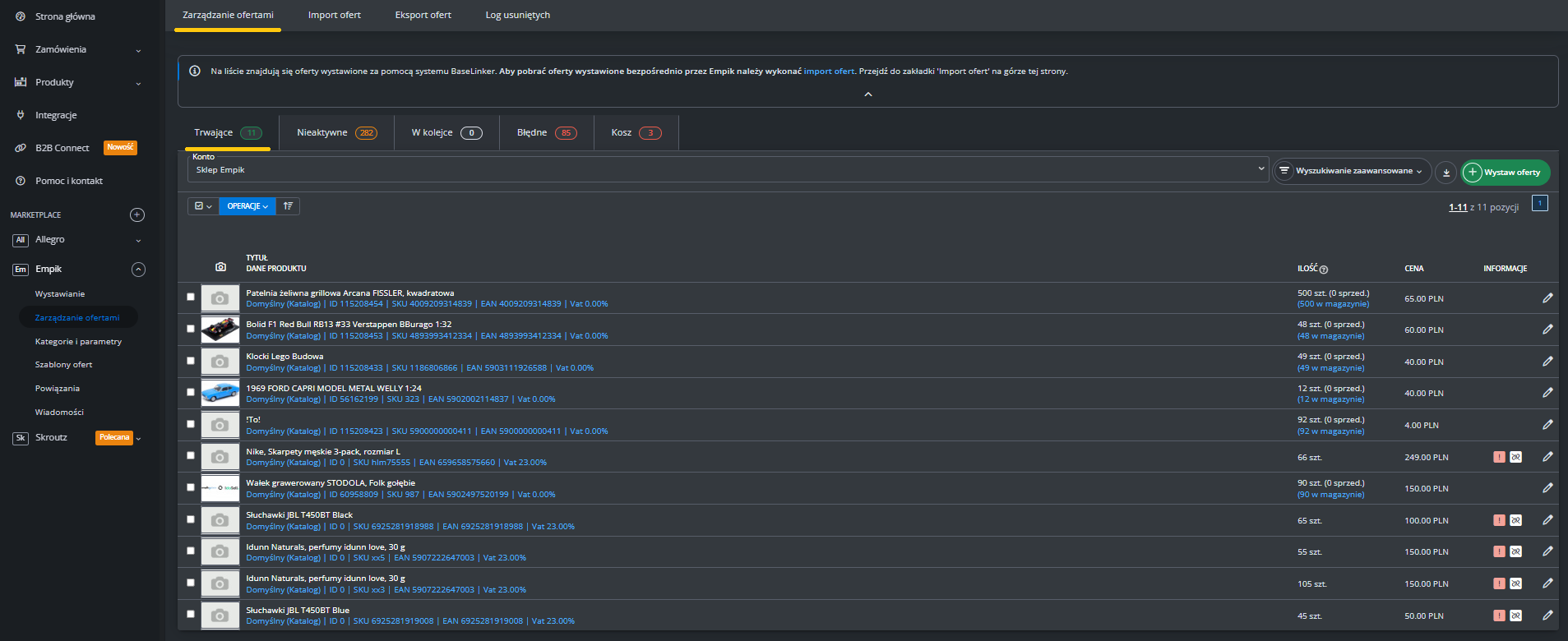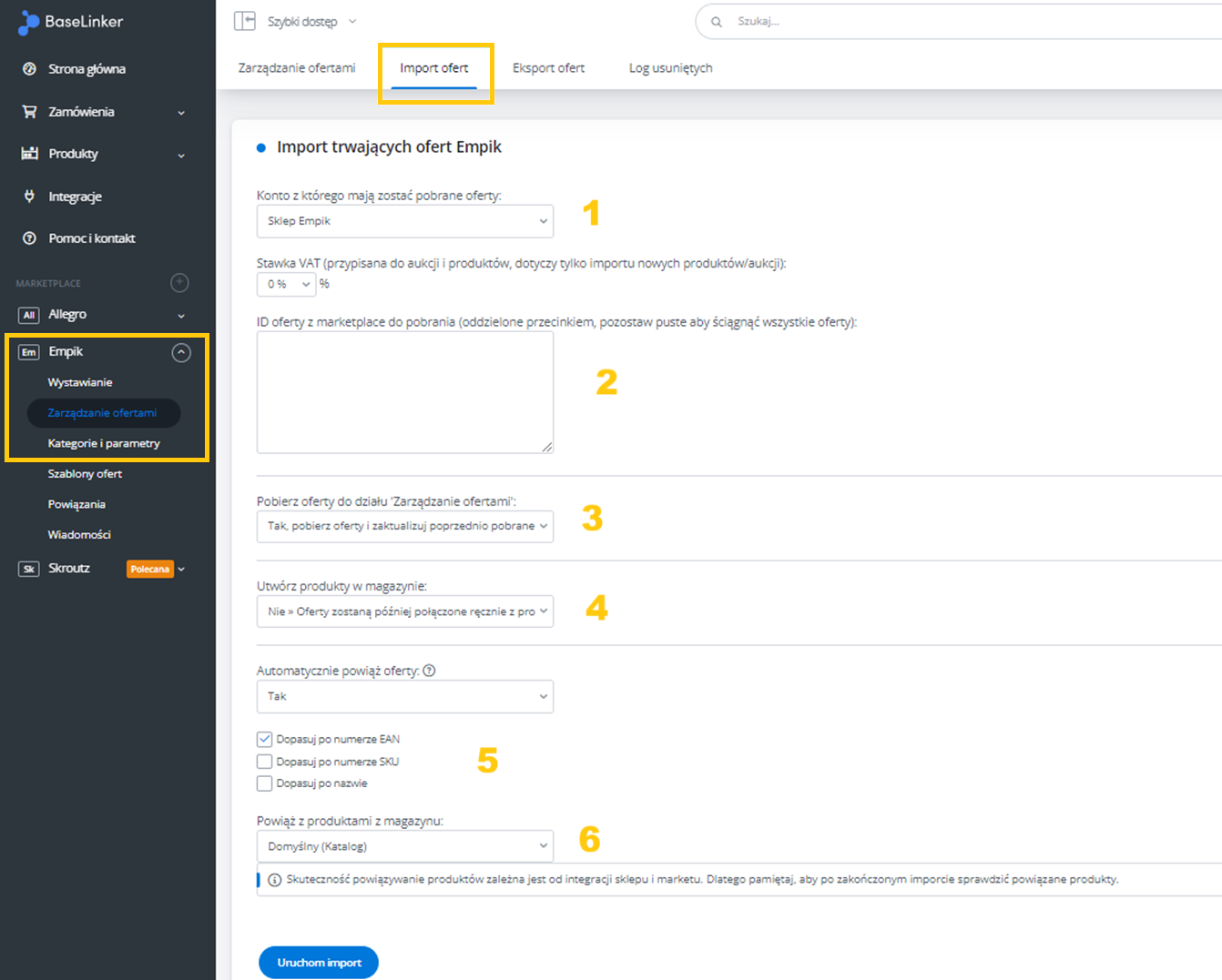 W menu przejdź do Produkty -> Import/Eksport -> Eksport i znajdź eksport "Oferty Empik Marketplace".