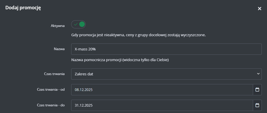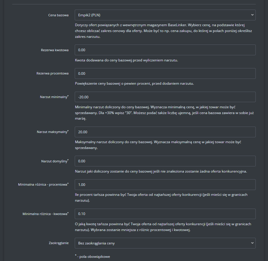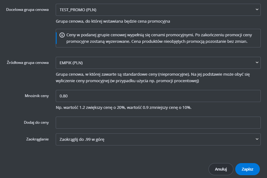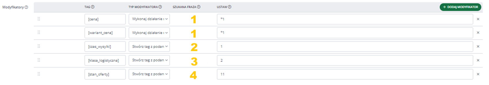 Np. jeśli chcesz pomnożyć wartość tagu razy 2, w polu wpiszemy "*2", jeżeli chcesz dodać 10% wpisz "*1.1", jeżeli chcesz doliczyć 10 zł, wpisz "+10".