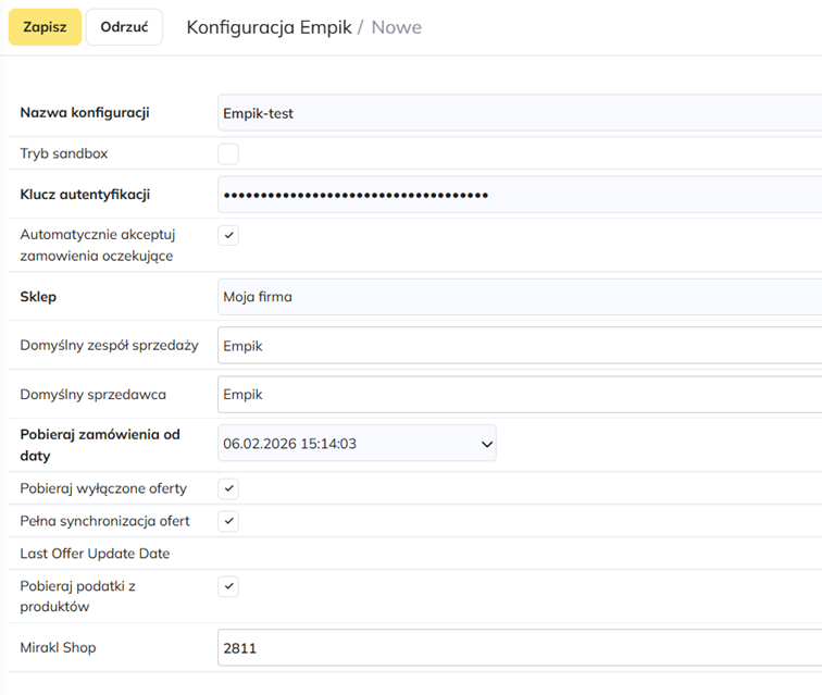 Wprowadź klucz API z panelu sprzedaży Empik. Klucz można wygenerować w:
