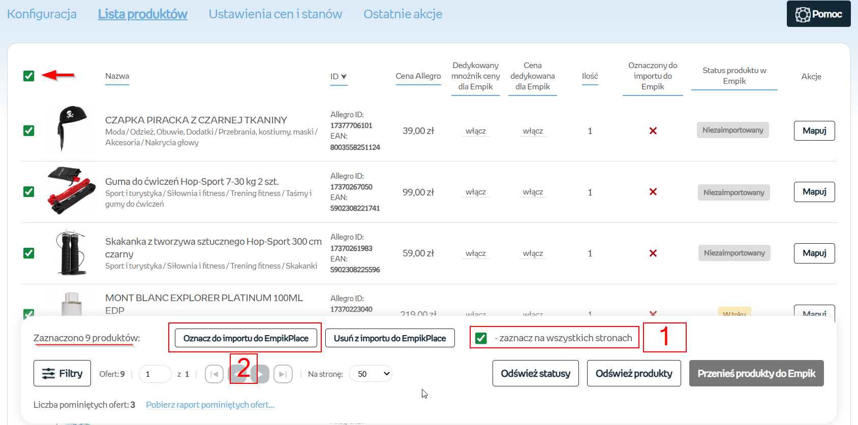 Następnie oznacz produkty do importu i wybierz opcję operacji "zaznaczonym" lub wybierz opcję "wszystkim" i wykonaj akcję "wystaw na Empik".