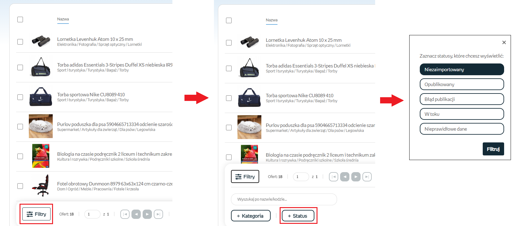 I kliknij "Szukaj". Sprawdzenie może zająć trochę czasu, który jest zależny od ilości produktów. Proces możesz obserwować sprawdzając ile produktów ma status "W trakcie sprawdzania". Po zakończeniu tego procesu, ustaw: