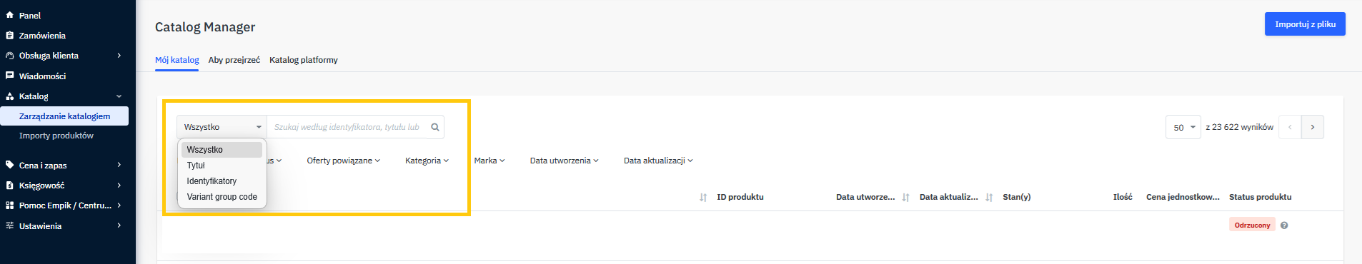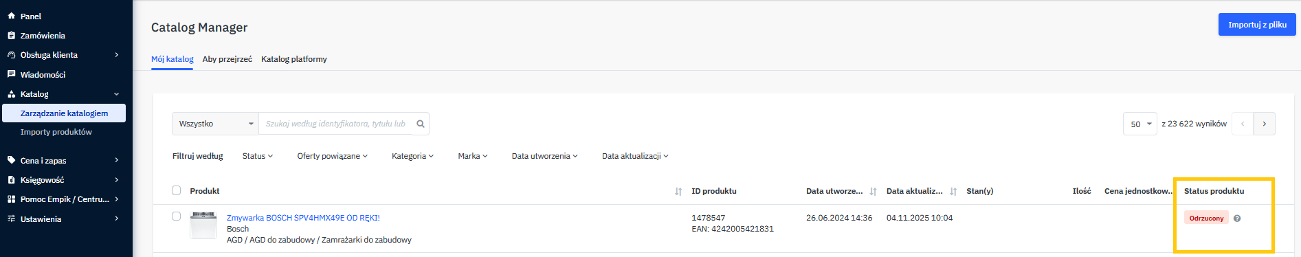 Wymagane zmiany | Produkt zawiera błędy i został odrzucony. Trzeba poprawić dane. |