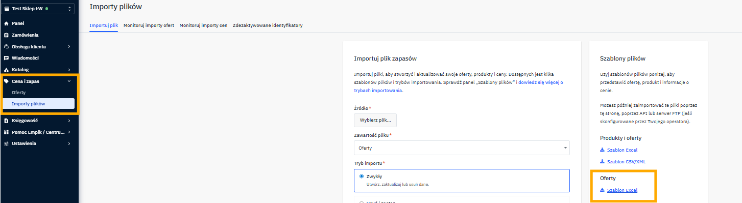 Zapisz plik i wgraj go do systemu, przechodząc do Cena i zapas > Importy ofert.