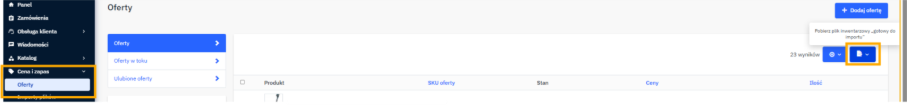 Wróć do Panelu Sprzedawcy i z menu po lewej kliknij Cena i zapas > Importy plików.