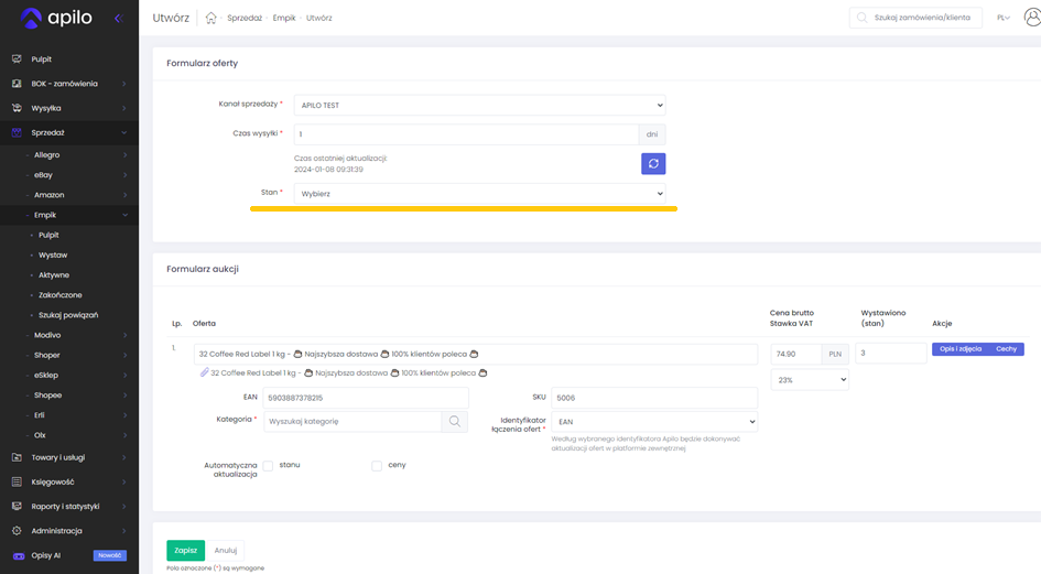 Jeśli chcesz dodać ofertę za pomocą Apilo, wystarczy, że w formularzu oferty, w polu „Stan” wybierzesz odpowiedni stan produktu.