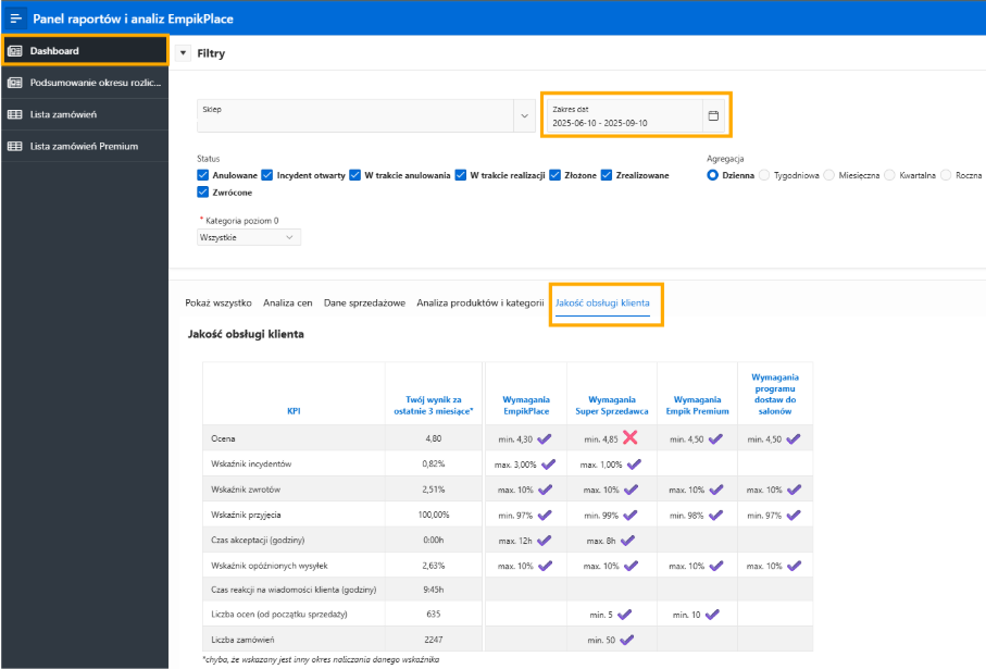 Jeśli ustawisz czas wysyłki na 0 dni, oznacza to, że każde zamówienie złożone danego dnia musisz wysłać jeszcze tego samego dnia. Obecnie nie ma możliwości ustawienia konkretnej godziny granicznej dla wysyłki tego samego dnia.Twoje wskaźniki z ostatnich 3 miesięcy mają wpływ na dostęp do niektórych benefitów oferowanych przez Empik.