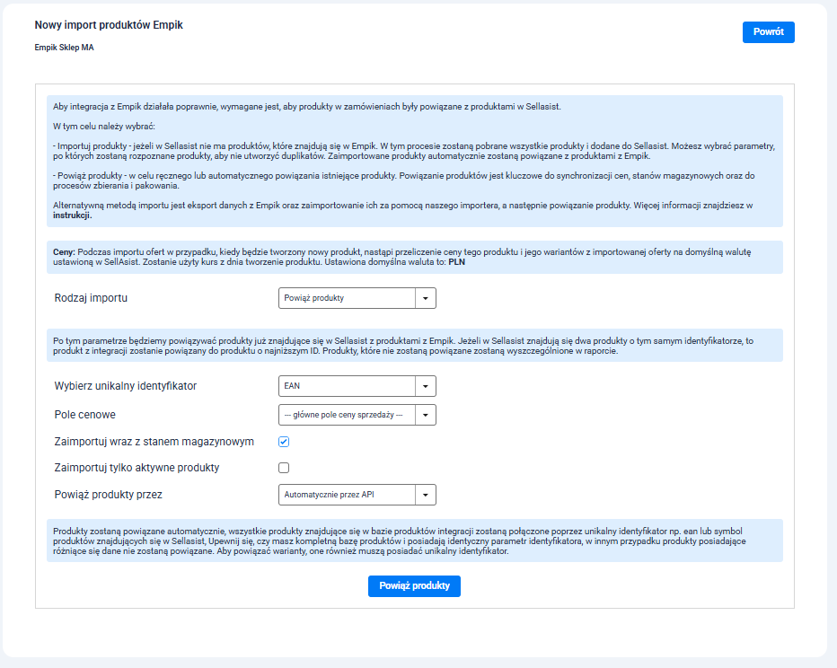 Jeżeli posiadasz aktywne oferty na empik.com, możesz je zaimportować do Sellasist i powiązać z produktami. Dzięki temu ich dane będą automatycznie aktualizowane w przyszłości.