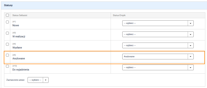 Opcjonalnym krokiem jest mapowanie statusów. Nowa integracja pozwala na zmapowanie tylko jednego statusu: anulowane. Pozostałe statusy obsługiwane są automatycznie.