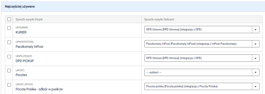 Aby zamówienia były prawidłowo przetwarzane i aby numery przesyłek poprawnie synchronizowały się z Empik.com, konieczne jest zmapowanie metod dostaw oraz przewoźników w Sellasist z ich odpowiednikami w Empik.