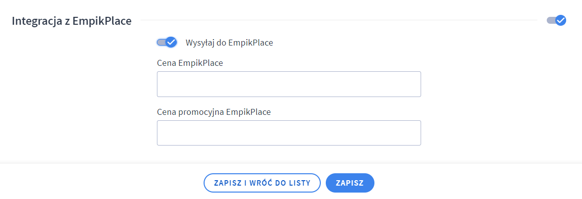 Jeżeli pole „Cena EmpikPlace” nie jest uzupełnione, wartość z pola „Cena promocyjna EmpikPlace” nie zostanie przesłana (w celu nadesłania ceny promocyjnej należy uzupełnić obydwa pola).