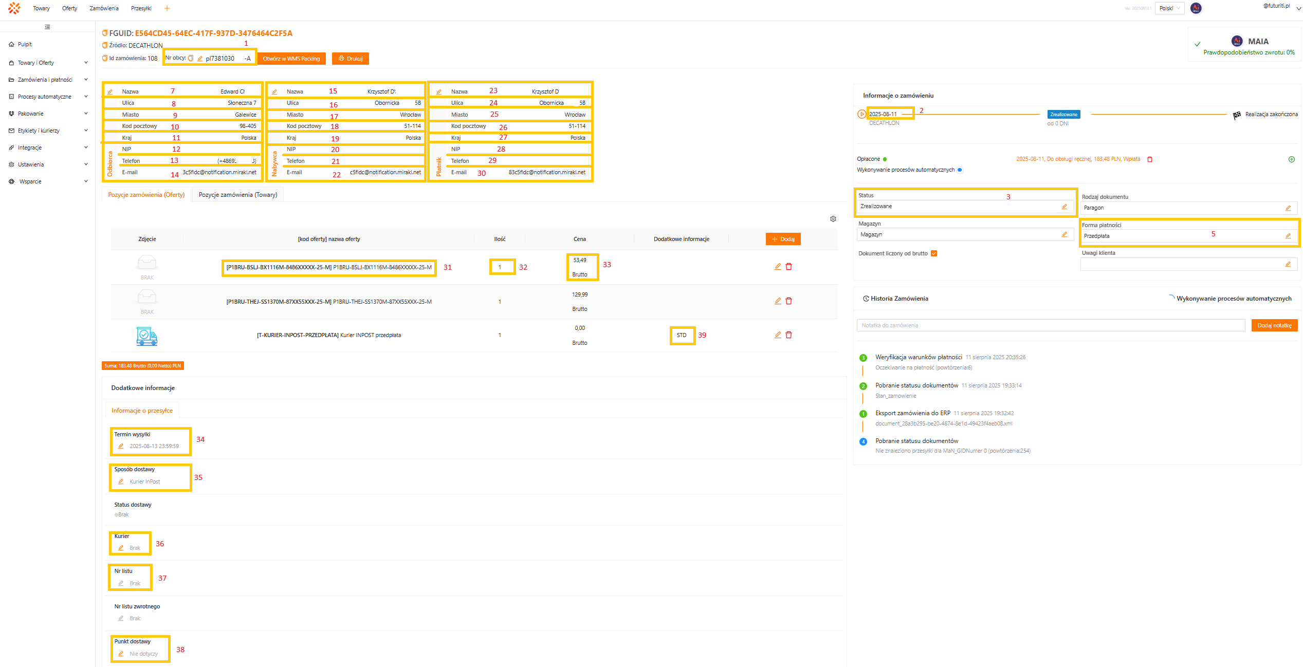 | Edycja zamówienia -> Formularz zamówienia -> Pozycje zamówienia (Oferty) | Dodatkowe informacje | 39 | Zamówienia -> Podgląd zamówienia -> Informacje -> Wysyłka | Sposób | 23 |