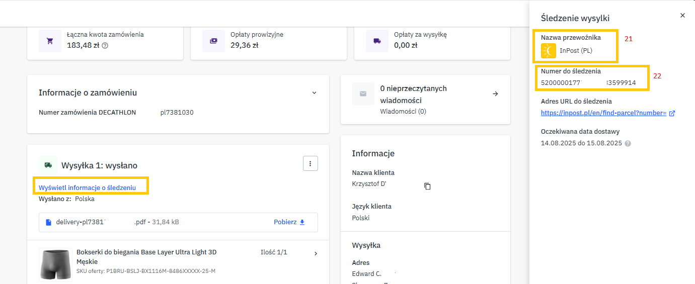 | Edycja zamówienia -> Formularz zamówienia -> Dodatkowe informacje -> Informacje o przesyłce | Kurier | 36 | Zamówienia -> Podgląd zamówienia -> Wysyłka -> Wyświetl informacje o śledzeniu | Nazwa przewoźnika | 21 |