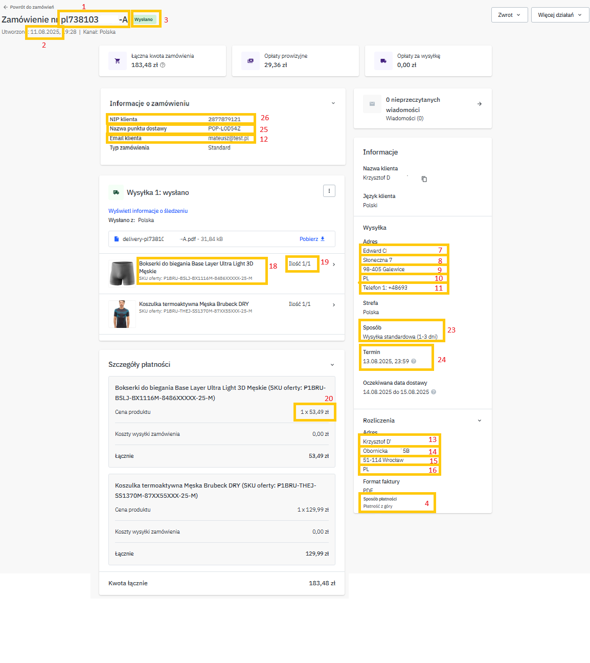 | Edycja zamówienia -> Formularz zamówienia -> Nabywca | 22 | Zamówienia -> Podgląd zamówienia -> Informacje o zamówieniu | Email klienta | 12 | |